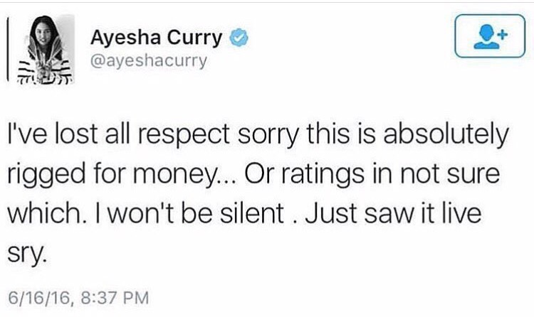 Q: Ayesha Curry was in the news today, she tweeted that she felt the game was rigged last night …