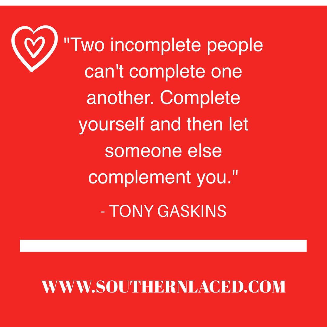 “Two incomplete people can’t complete one another. Complete yourself and then let someone else complement you.” – Tony Gaskins