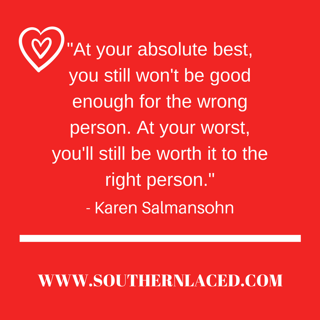 “At your absolute best, you still won’t be good enough for the wrong person. At your worst, you’ll still be worth it to the right person.” -Karen Salmansohn