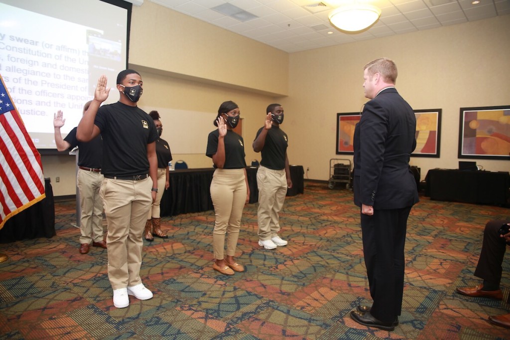 Later, McCarthy conducted a swear-in for future soldiers and presented three cadets with nearly $45,000 scholarships each for the next three years.
