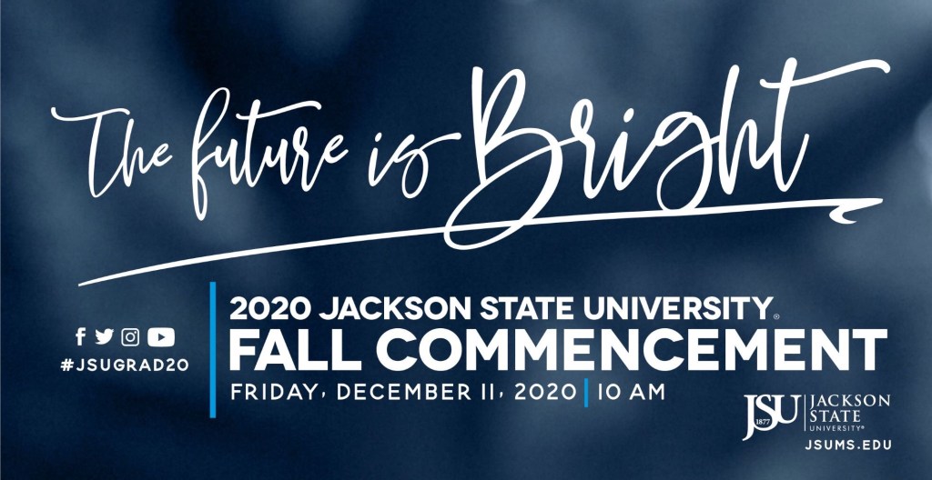 (JACKSON, Miss.) — Jackson State University’s live virtual Fall 2020 Commencement will be at 10 a.m. Friday, Dec. 11, and it will bestow 372 undergraduate and 175 graduate degrees in a non-traditional ceremony due to COVID-19.