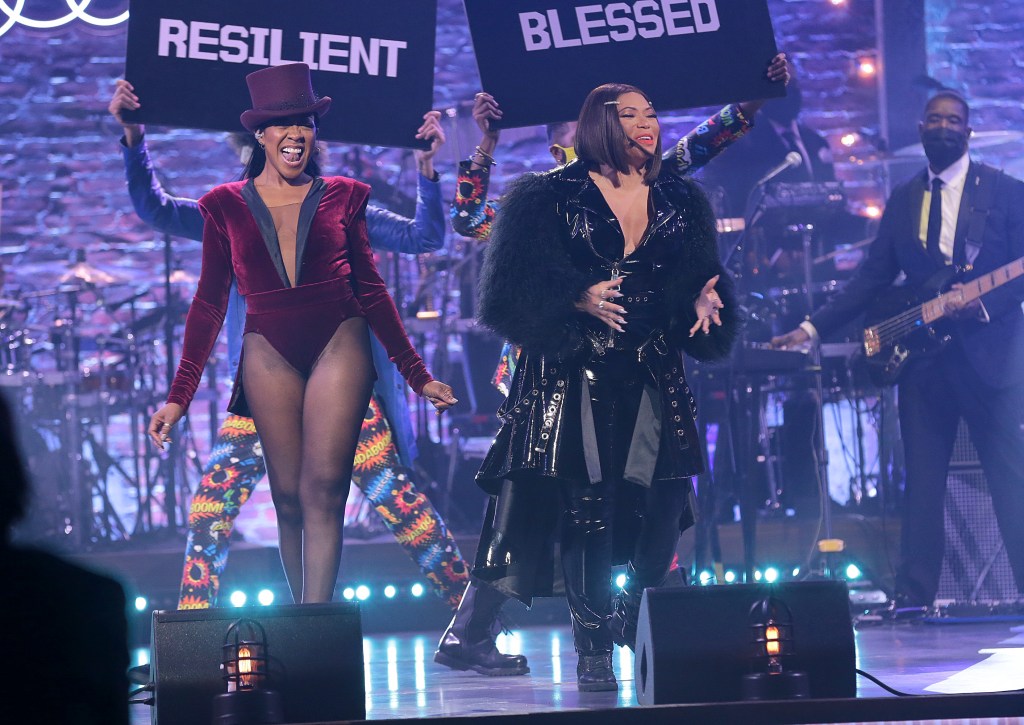 LOS ANGELES, CALIFORNIA – NOVEMBER 29: LOS ANGELES, CA – NOVEMBER 29: In this image released on November 29th, Tisha Campbell and Tichina Arnold perform during the 2020 Soul Train Awards presented by BET. (Photo by Leon Bennett/STA 2020/Getty Images for BET)