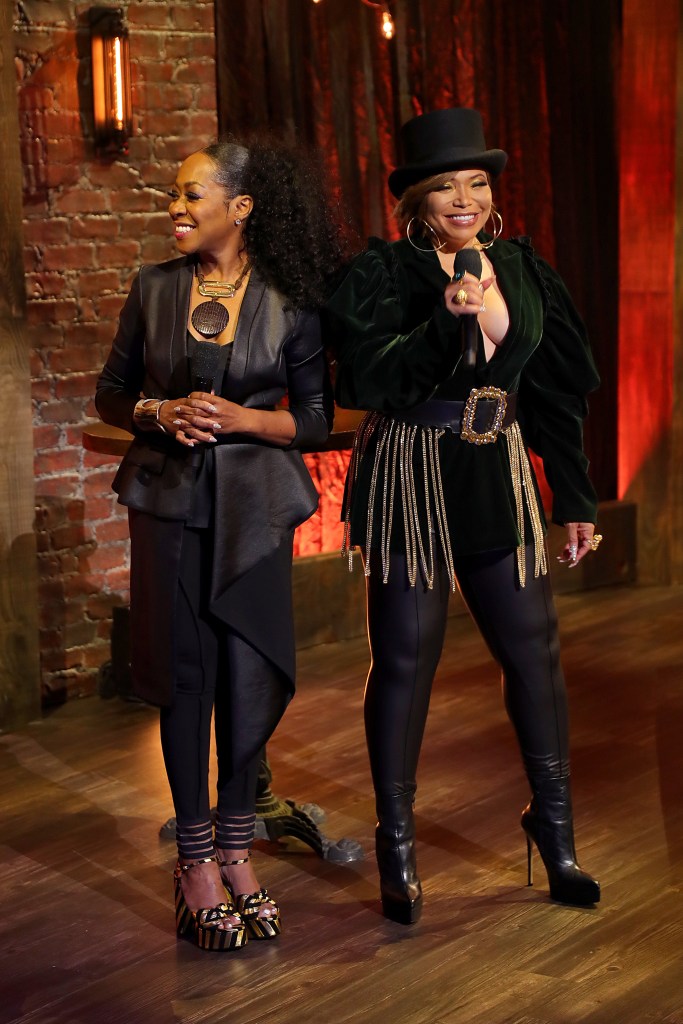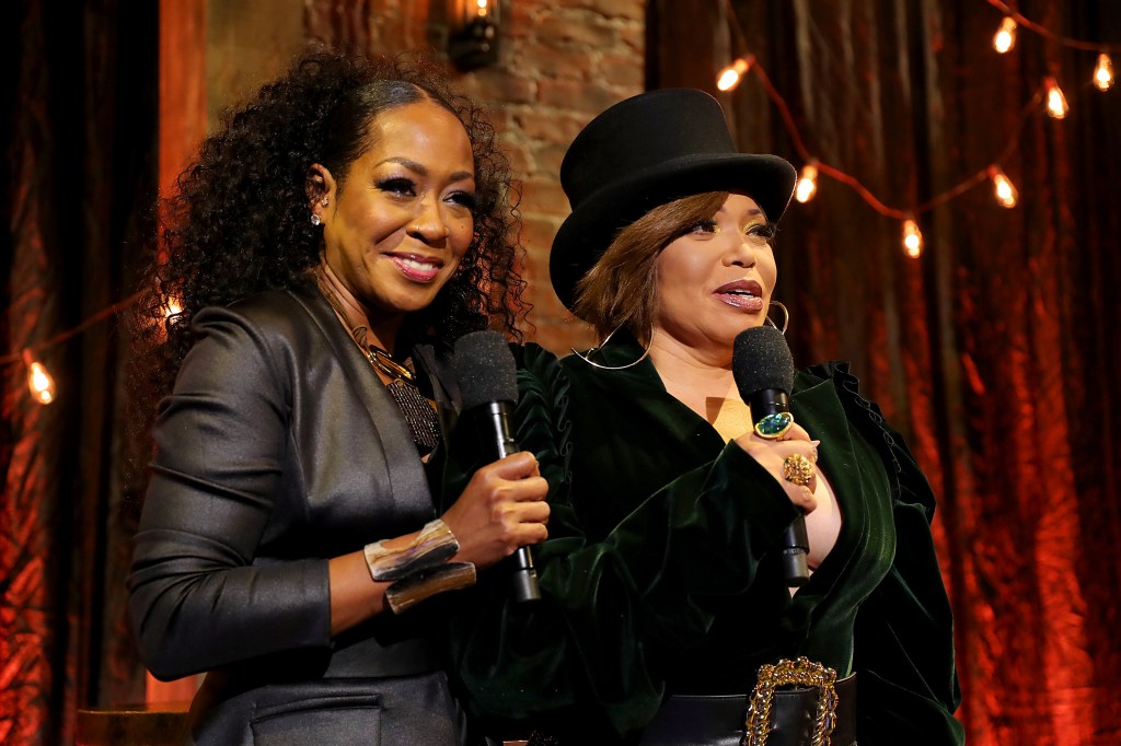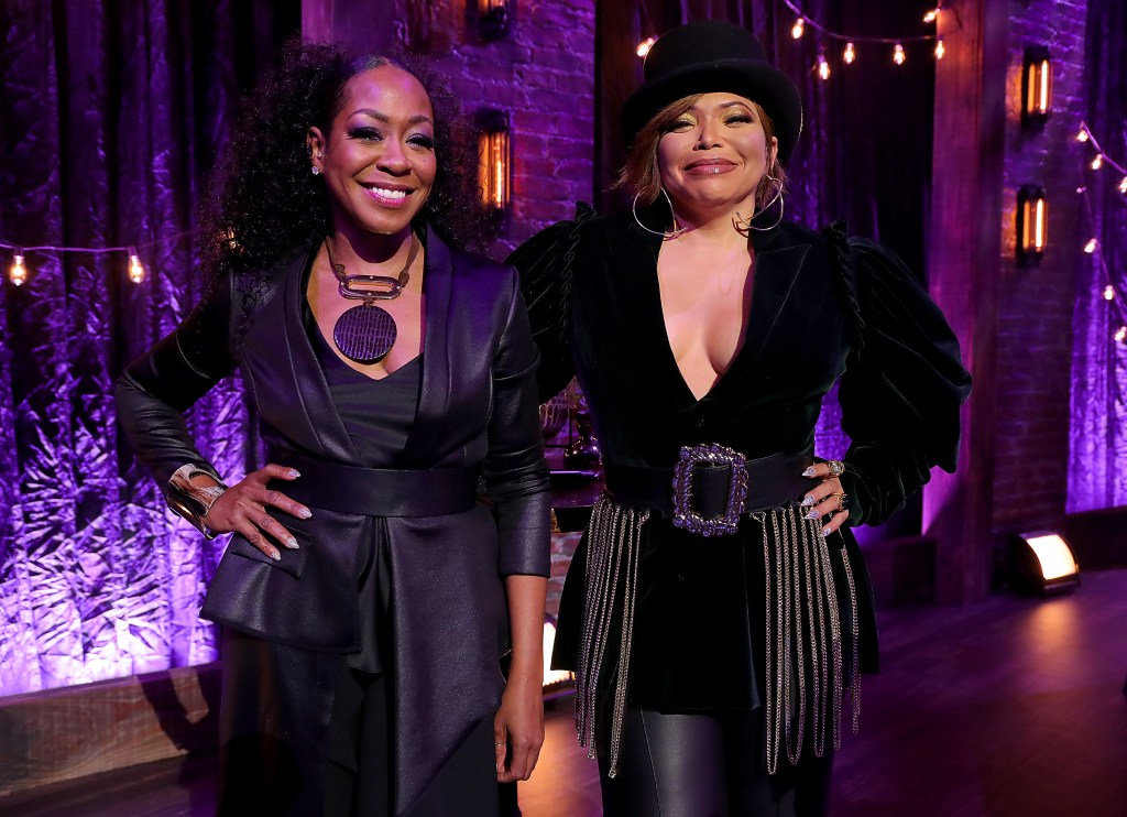LOS ANGELES, CALIFORNIA – NOVEMBER 29: LOS ANGELES, CA – NOVEMBER 29: In this image released on November 29th, Tichina Arnold and Tisha Campbell speak during the 2020 Soul Train Awards presented by BET. (Photo by Leon Bennett/STA 2020/Getty Images for BET)