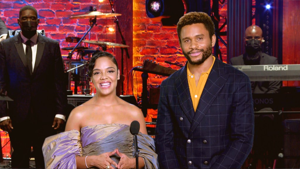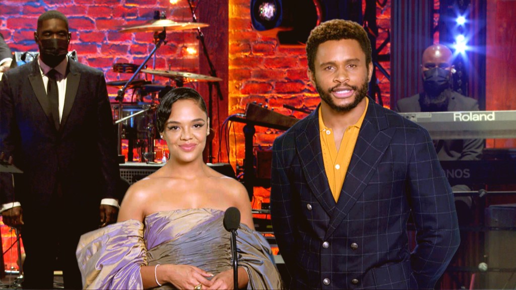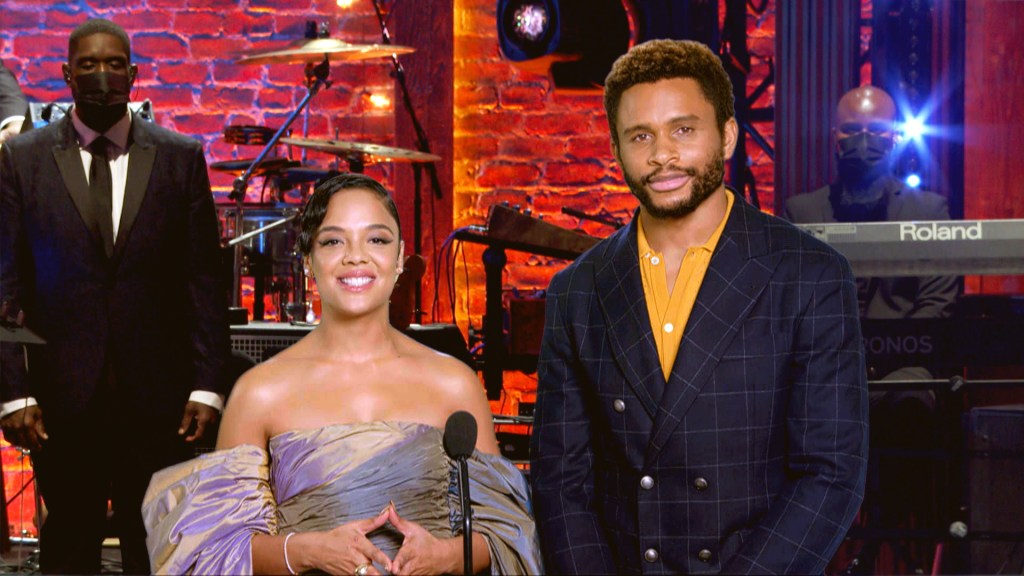 LOS ANGELES, CALIFORNIA – NOVEMBER 29: LOS ANGELES, CA – NOVEMBER 29: EDITORIAL USE ONLY. In this screengrab released on November 29th, Tessa Thompson and Nnamdi Asomugha speak at the 2020 Soul Train Awards presented by BET. (Photo by 2020 Soul Train Awards/via Getty Images)