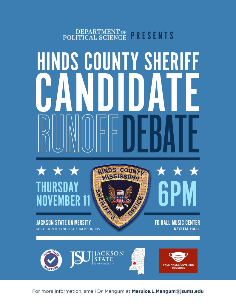 (JACKSON, Miss.) — Jackson State University’s Department of Political Science in the College of Liberal Arts will host a runoff debate between Hinds County Sheriff’s candidates Tyree Jones and Marshand Crisler. The event is scheduled at 6 p.m. on Thursday, Nov. 11, in the FD Hall Music Center Recital Hall.