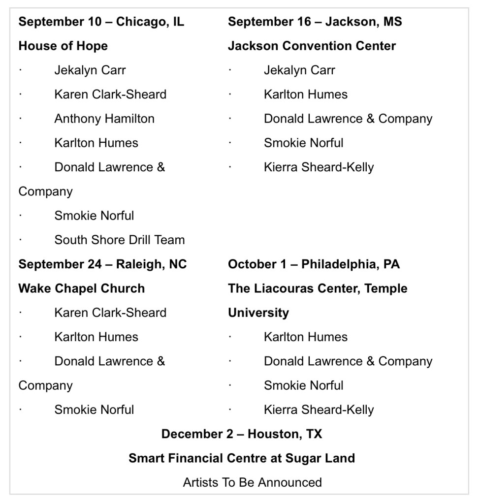 “Gospel Music has always been the heart and soul of the Black community. Our sound… our rhythms, our original hymns have sustained the community for generations,” said GRAMMY Award Winner and Tour Artist Smokie Norful. “It is a blessing to be back performing live on the Inspiration Celebration Gospel Tour and to be in devotion with some of the greatest artists in the industry.”
