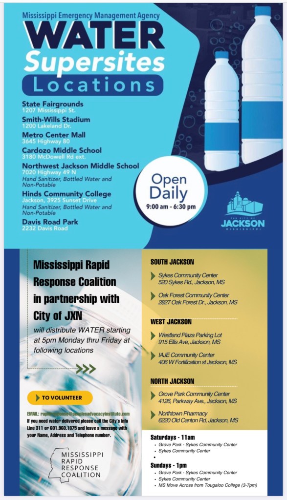 The Mississippi Rapid Response Coalition and the City of Jackson will release weekly water pickup schedules via the following social media platforms: