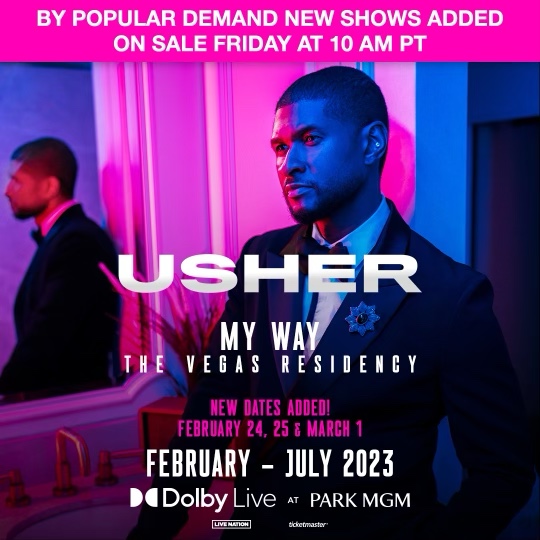 LAS VEGAS (December 20, 2022) – After selling out all 25 of his 2022 shows at Dolby Live at Park MGM, global megastar and eight-time GRAMMY Award-winner Usher has announced three additional 2023 dates for his headlining residency on February 24 and 25 and March 1, 2023.