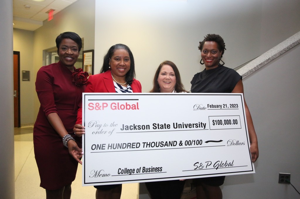 JACKSON, Miss. – The Jackson State University College of Business (COB) hosted its first S&P Global Day last week. University leaders and COB faculty, staff, and students joined representatives from the company for a breakfast program to kick off the day’s events. During the breakfast, the company pledged $100,000 in scholarship funds to JSU.