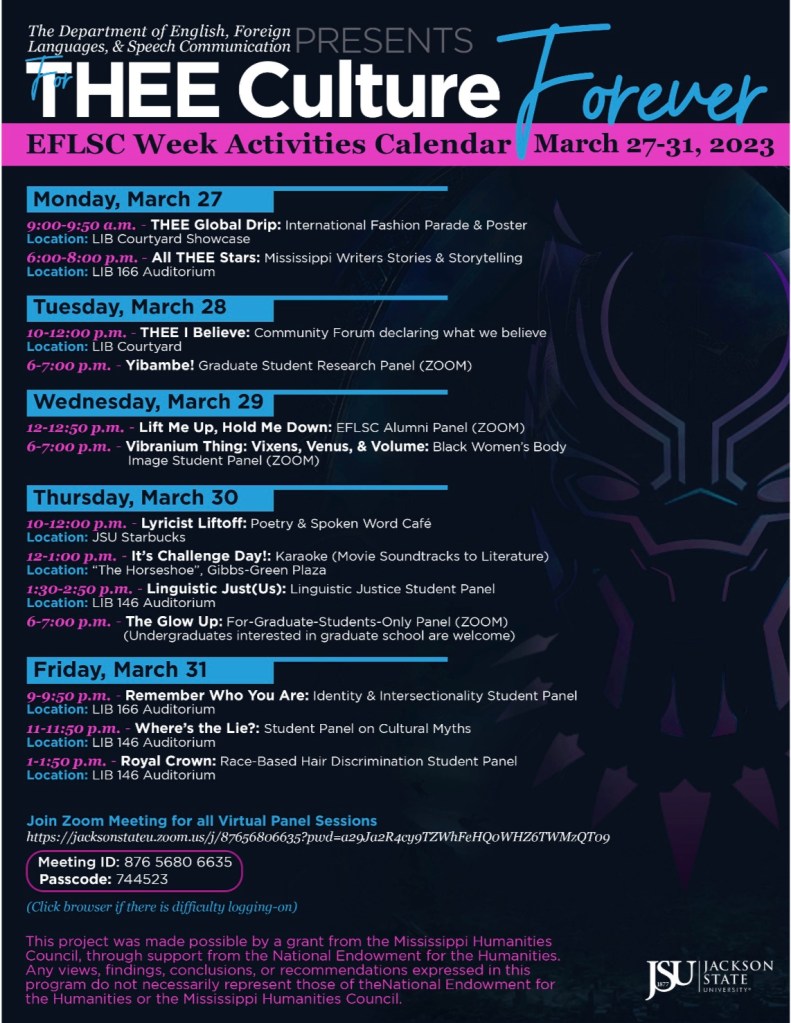 JACKSON, Miss –Jackson State University’s Department of English, Foreign Languages, & Speech Communication (EFLSC) is hosting “THEE Culture Forever” EFLSC week from Monday, Mar. 27 – Friday, Mar. 31.