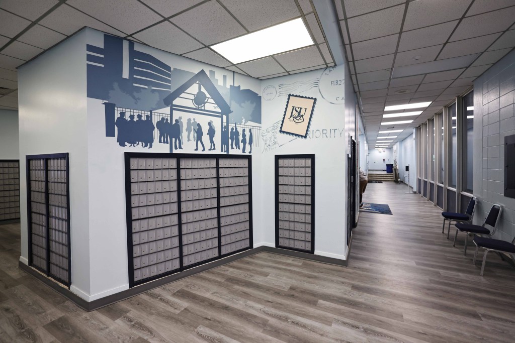 Illustrations of historical figures such as Jackie Robinson, Constance Baker Motley, Joanne Trumpauer, Malcolm X, Booker T. Washington and César E. Chávez cover part of the wall alongside postal stamps and other cultural elements. Another section highlights the first Black women mail carriers for the U.S. Army and a depiction of the 1970 Gibbs-Green tragedy, featuring Philip L. Gibbs and James Earl Green.