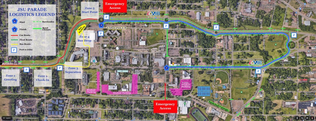 The parade will turn back west on Pascagoula Street and then merge into University Boulevard. Once the parade reaches the judge’s viewing stand at the intersection of University Boulevard and J.R. Lynch Street, it will turn west towards Dalton Street, where it will conclude.